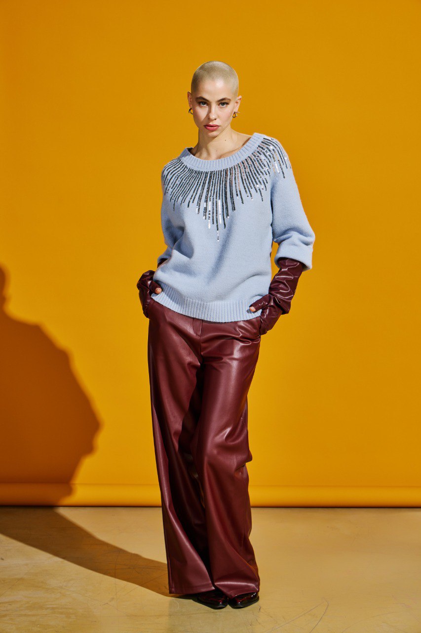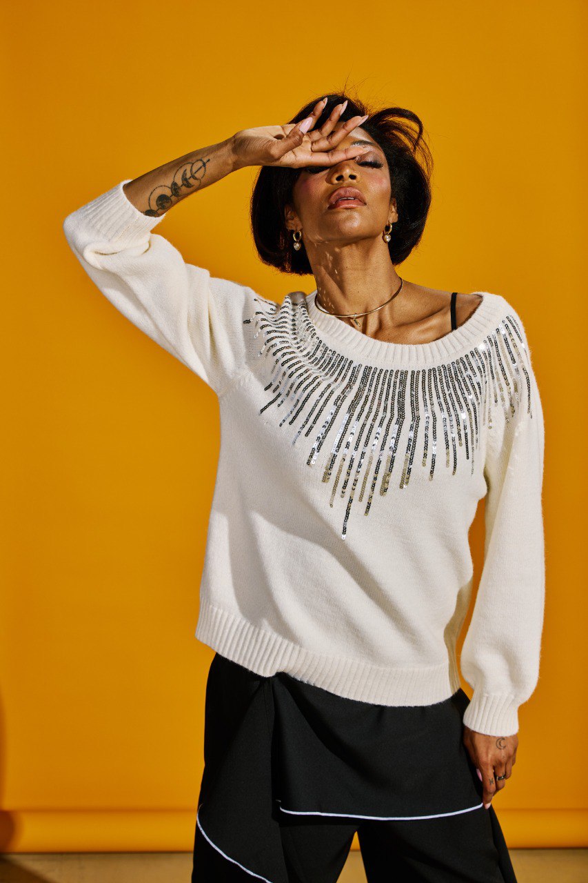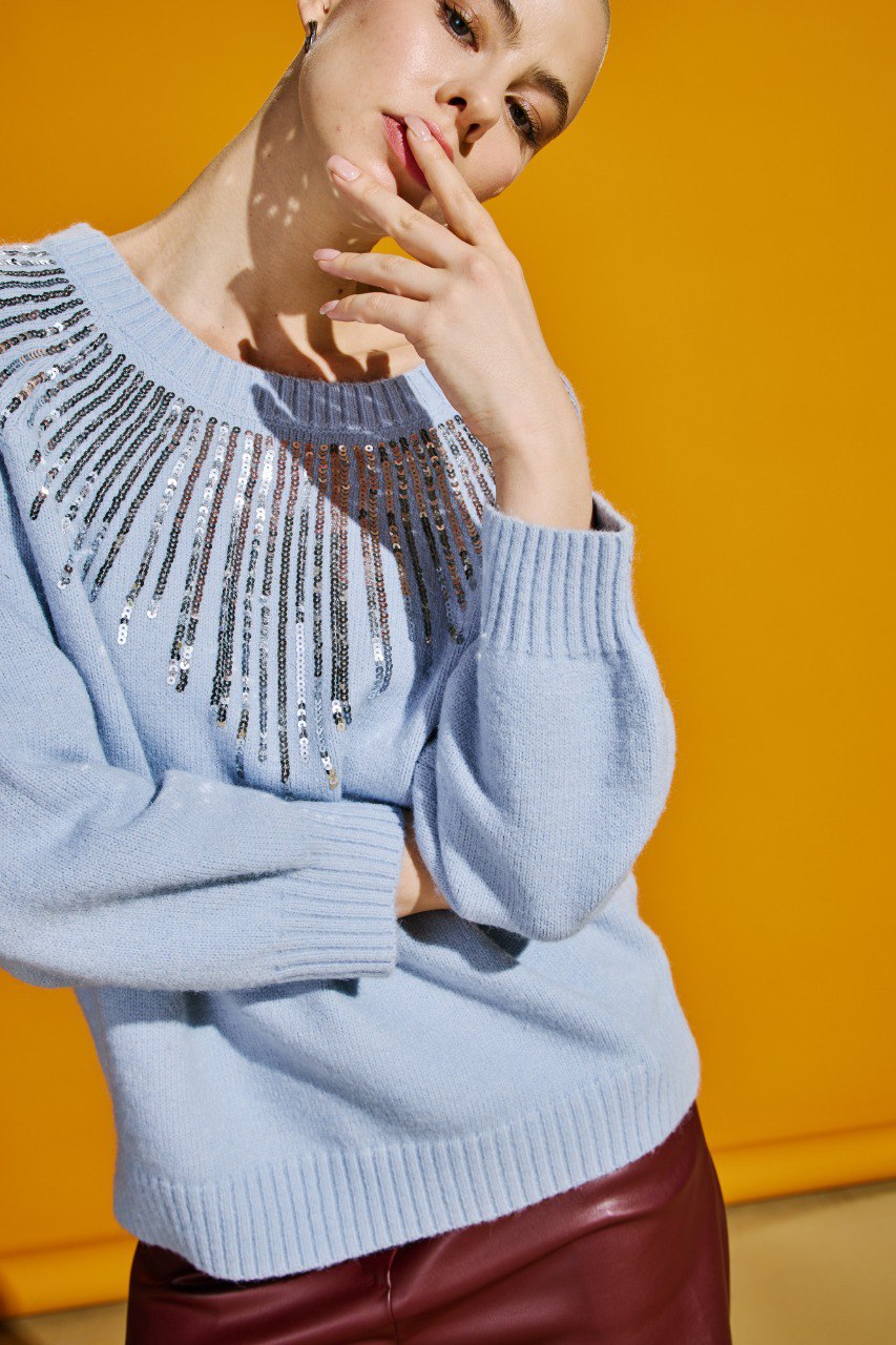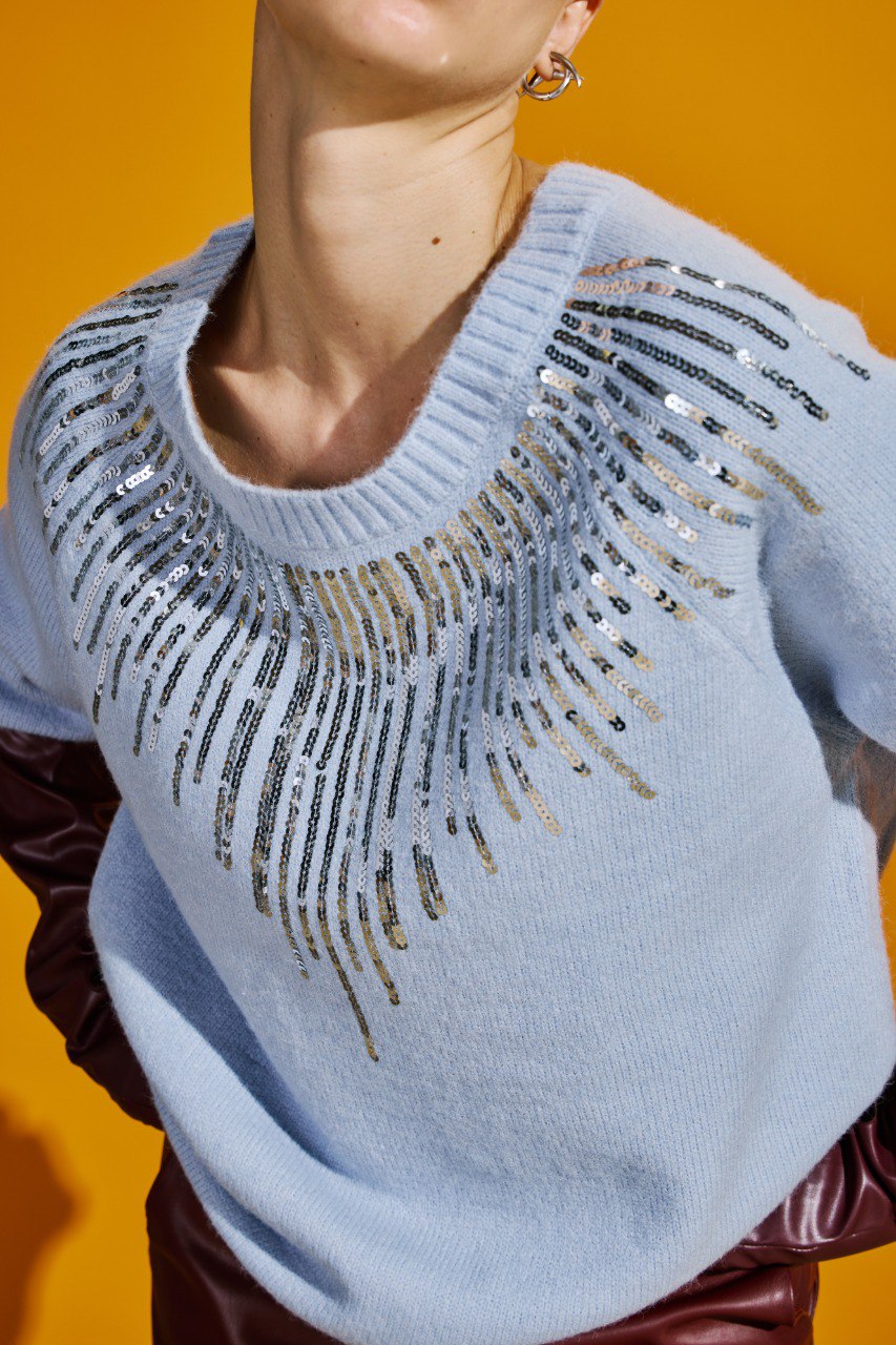 Джемпер для смелых и ярких! Он создан для тех, кто не боится быть в центре внимания. Пайетки, в зоне декольте, создают неповторимый эффект живого мерцания, напоминающий о бесконечных просторах космоса.