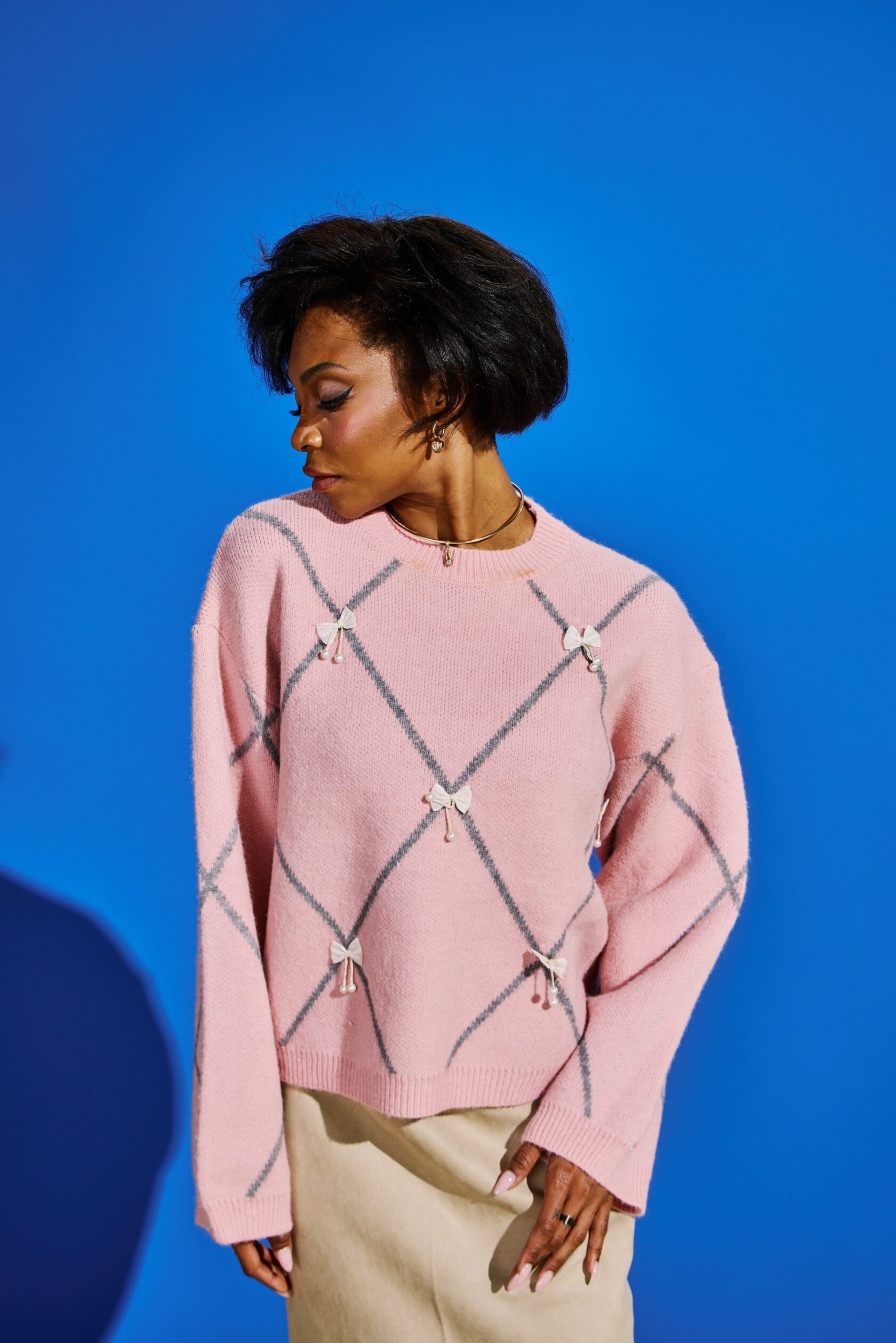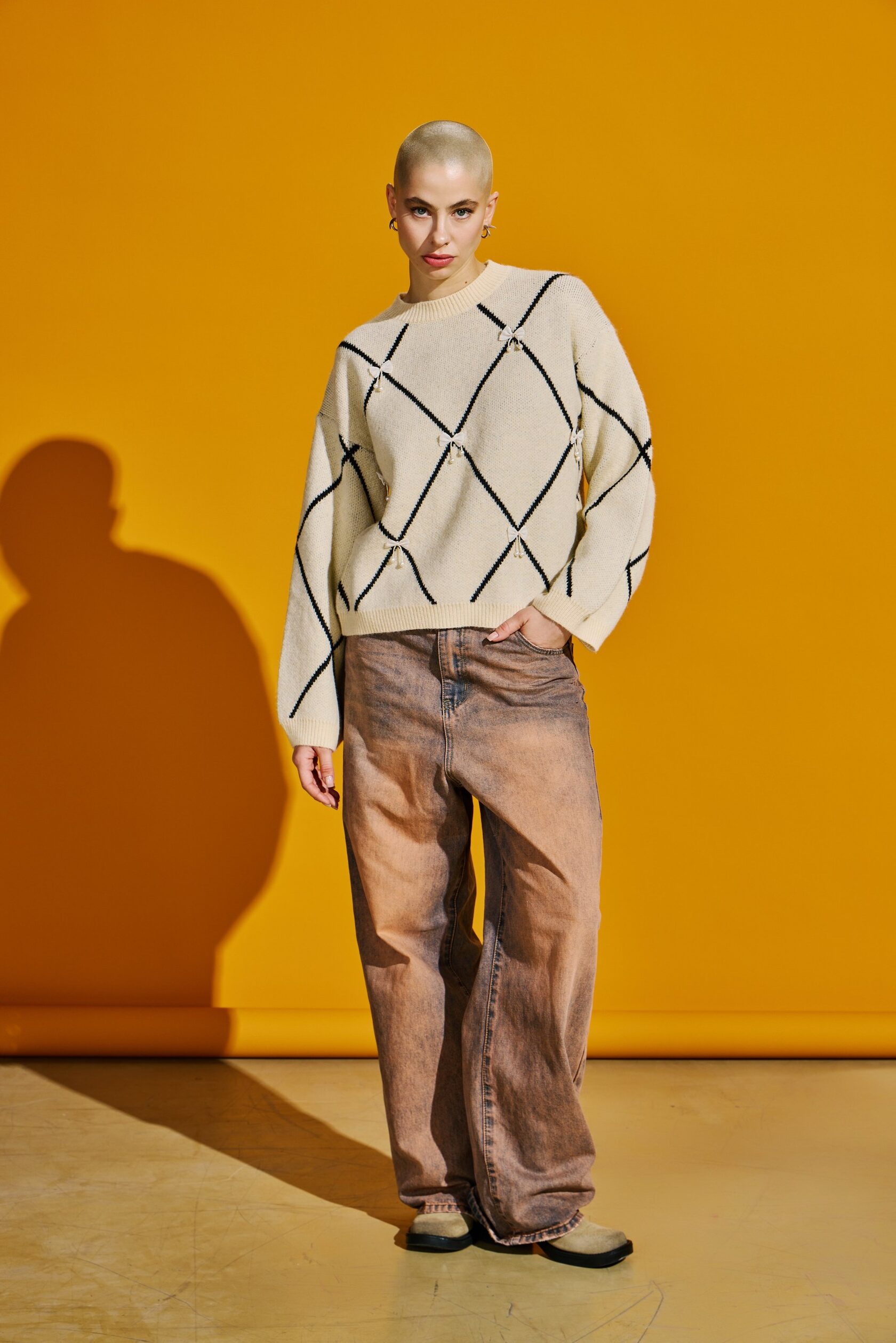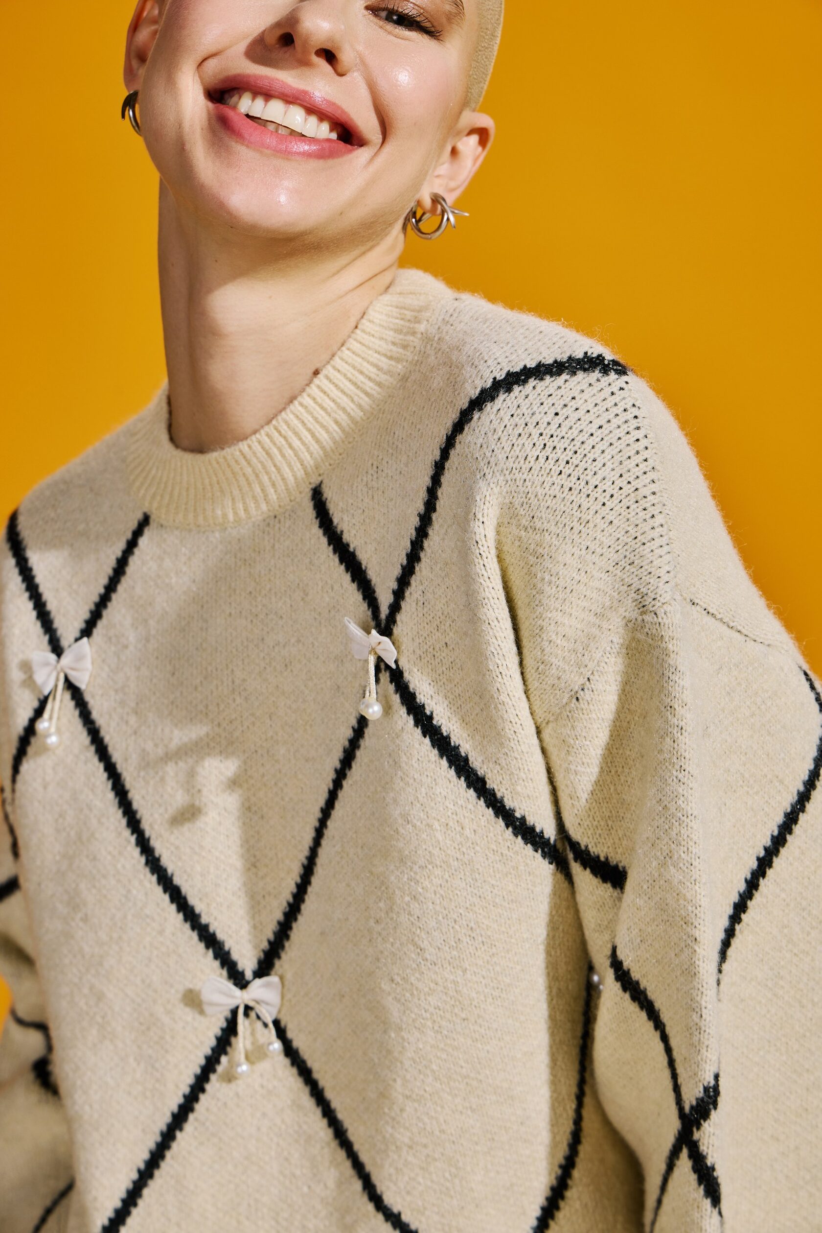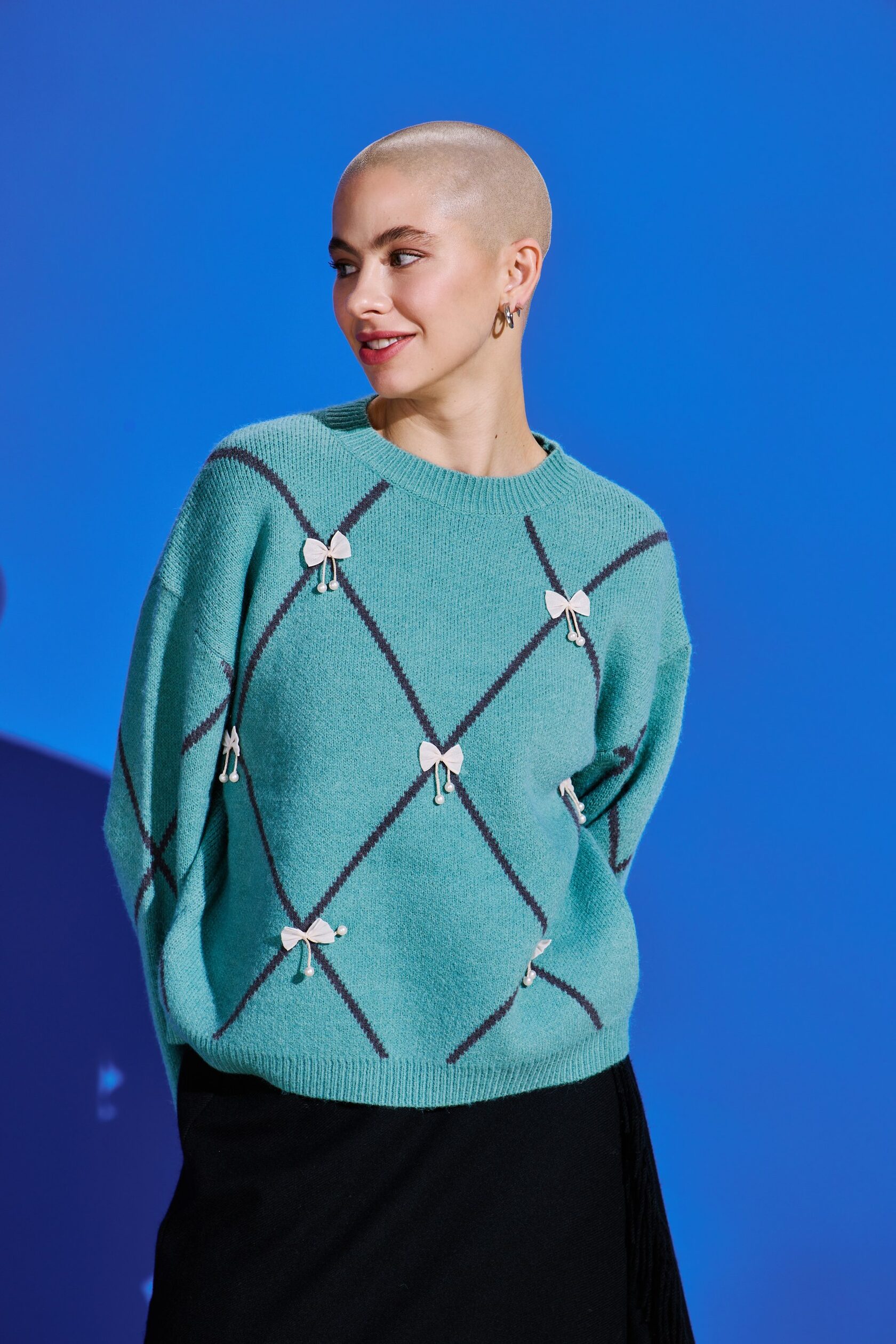 Джемпер свободного кроя обеспечивает абсолютный комфорт и свободу движений на весь день. Его образ дополняет объемный декоративный декор в виде бантиков в актуальном стиле cutecore, который сочетается с элементами безвременной классики в геометрических линиях.