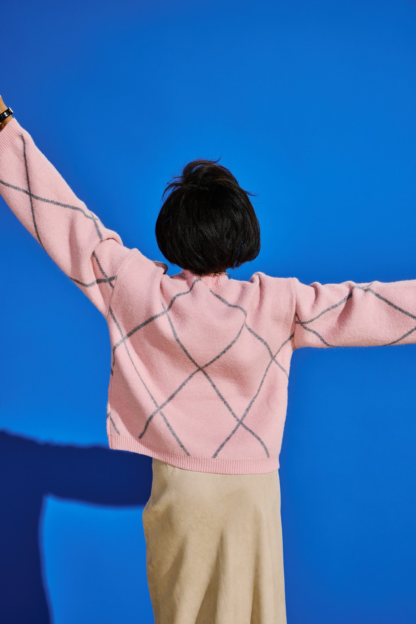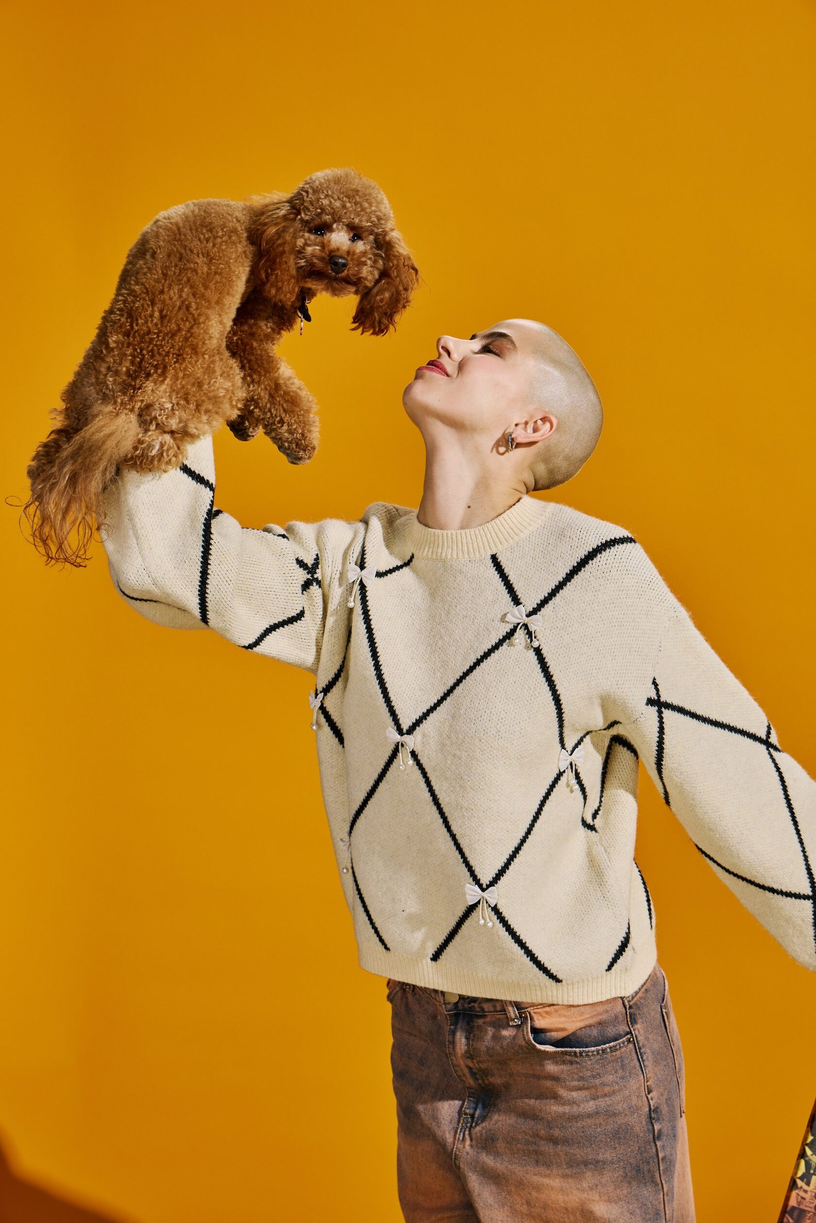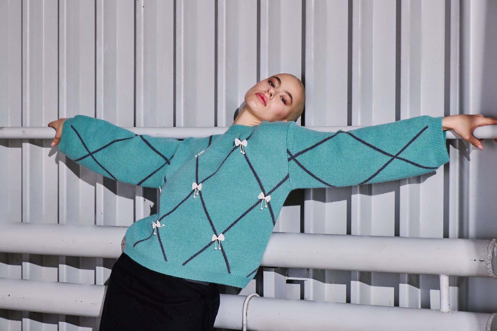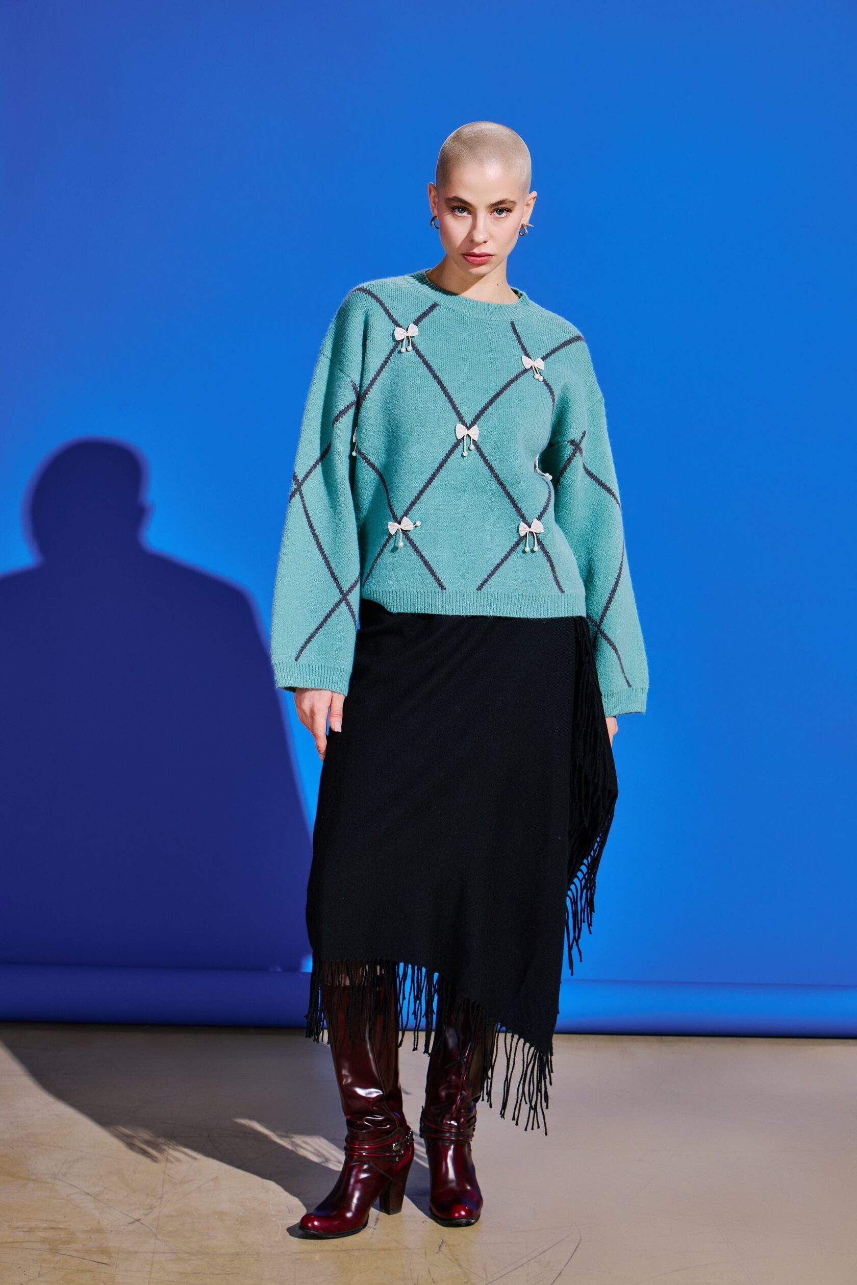 Джемпер свободного кроя обеспечивает абсолютный комфорт и свободу движений на весь день. Его образ дополняет объемный декоративный декор в виде бантиков в актуальном стиле cutecore, который сочетается с элементами безвременной классики в геометрических линиях.
