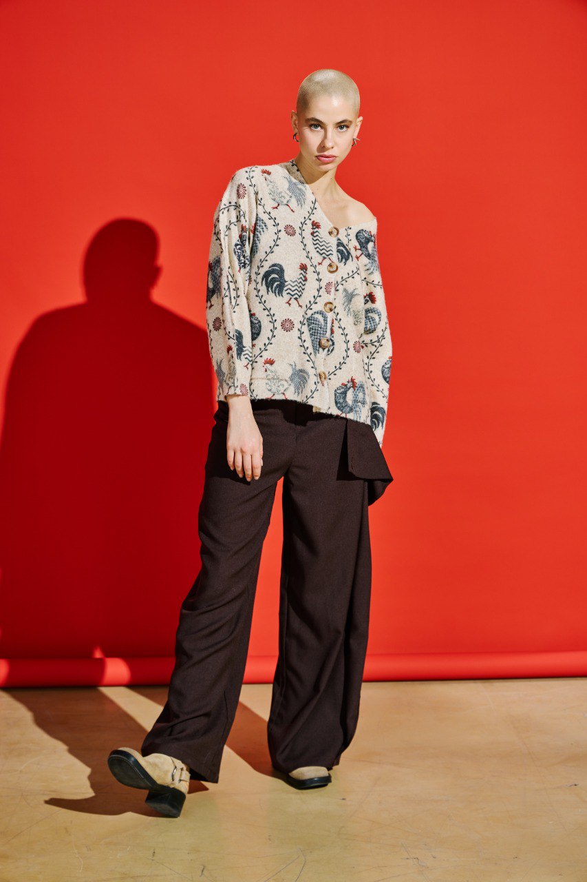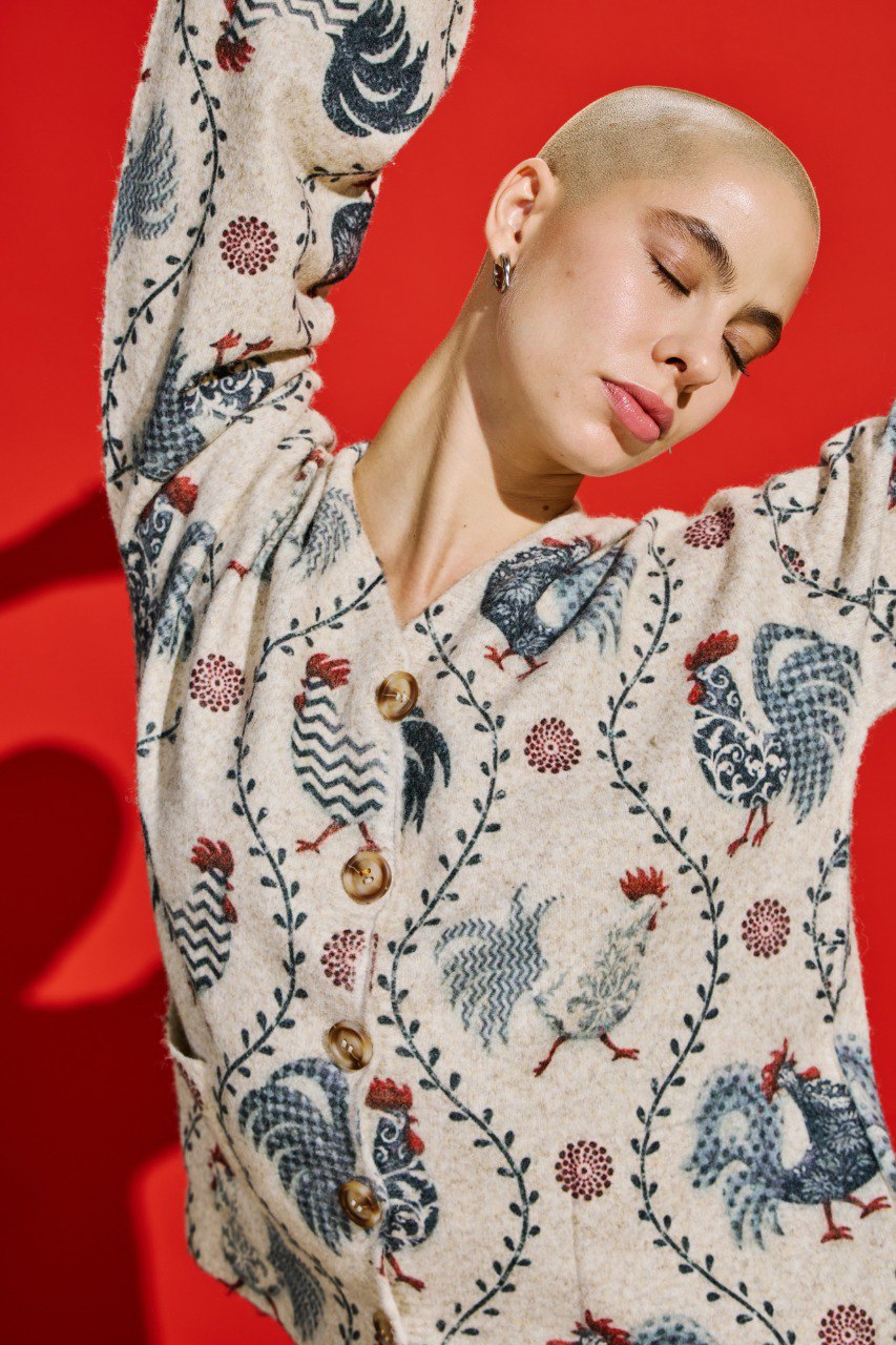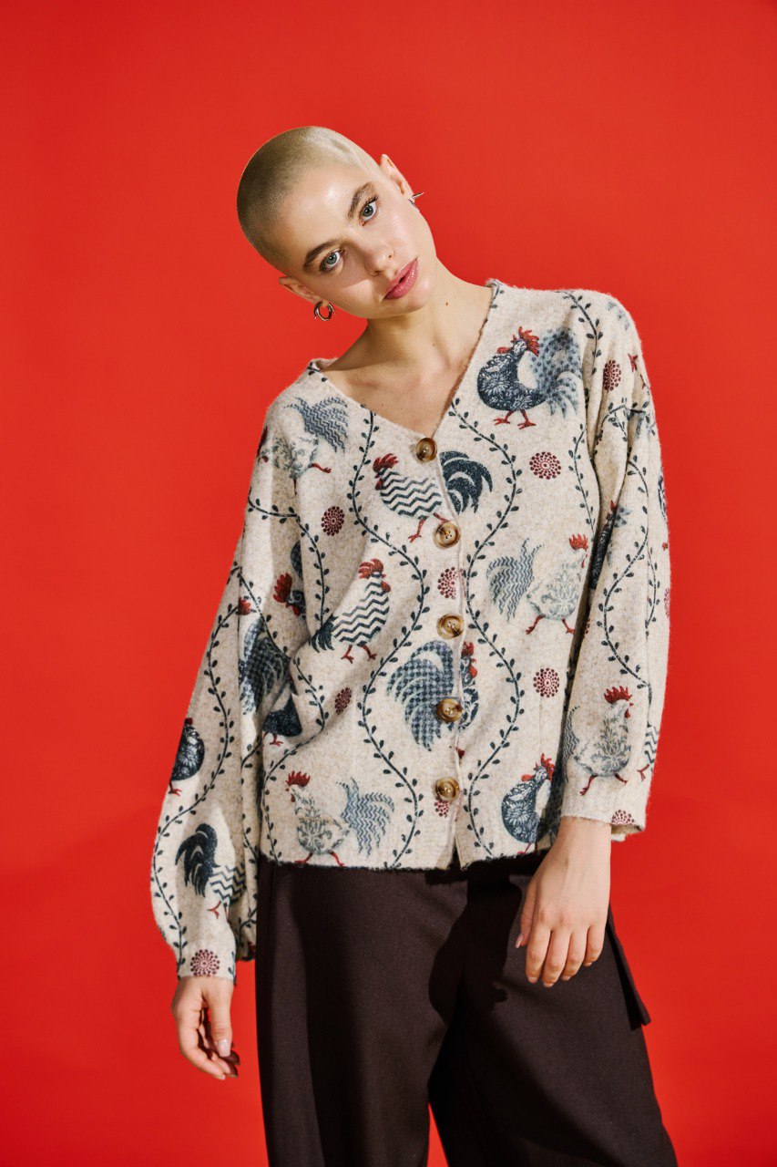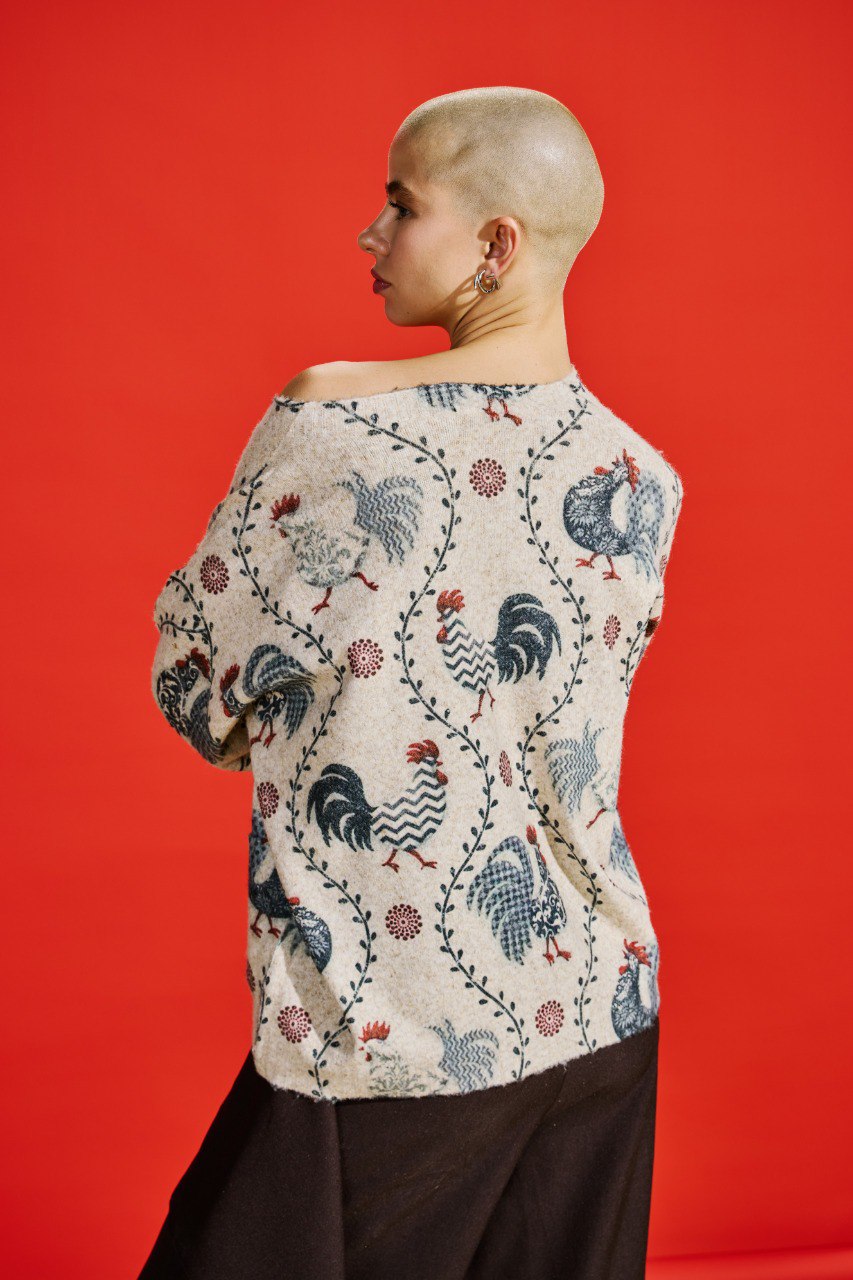 Яркий и харизматичный кардиган, который не останется незамеченным! Смелый принт с изображением петухов символизирует энергию, уверенность и новый старт. Выполненный из качественной мягкой пряжи, этот кардиган станет центральным элементом вашего образа, добавляя ему индивидуальности и динамики. Идеально подходит для тех, кто не боится выделяться.